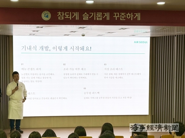 이어 두 번째 세션에서는 정호영 셰프가 기내식 기획과 메뉴 개발 과정을 주제로 특강을 진행했다. 정 셰프는 기내라는 제한된 환경에서 조리 방식이 달라지는 점, 맛의 균형을 맞추는 방법, 메뉴 개발 시 고려 요소 등을 설명하며 기내식 제작 과정의 특징을 소개했다.