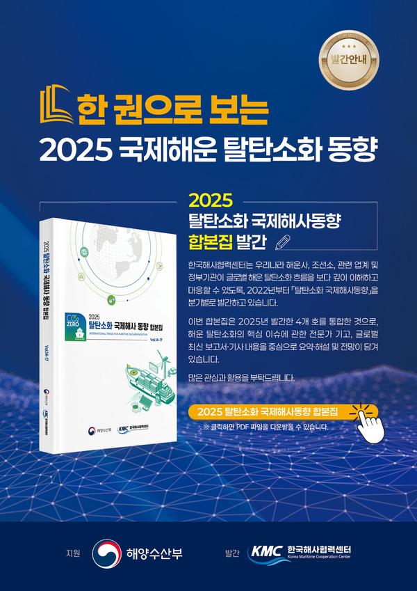 한국해사협력센터는 국제적으로 강화되는 선박 온실가스 환경규제 동향을 종합 분석한 ‘2025 탈탄소화 국제해사동향 합본집’을 발간했다고 18일 밝혔다.
