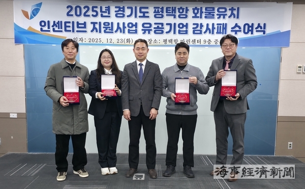 경기평택항만공사(사장 직무대행 김금규)는 최근 평택항 마린센터에서 ‘2025년 경기도 평택항 화물유치 인센티브 지원사업’과 관련해 평택항 물동량 증대와 항만 활성화에 기여한 해운 물류 기업에 감사패를 전달했다고 23일 밝혔다.