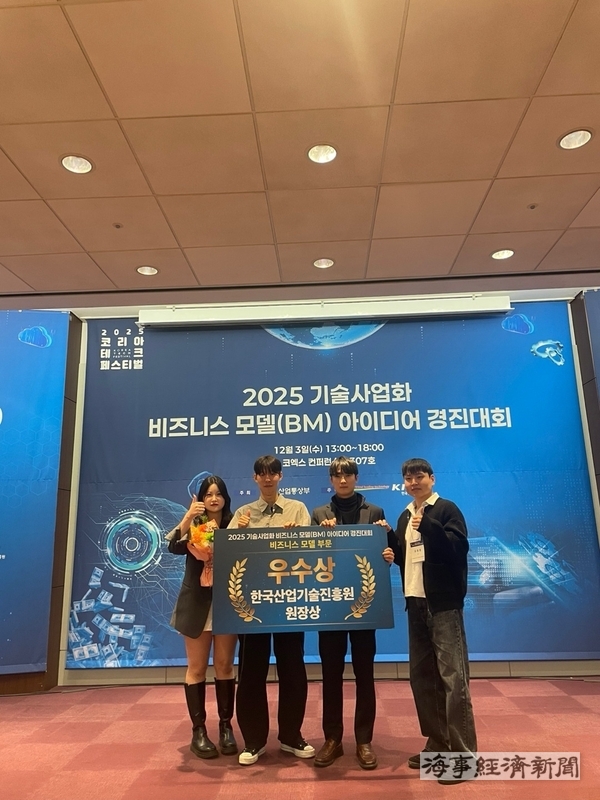 국립한국해양대학교 RISE 사업단 소속 창업동아리 FARMVEST팀이 한국산업기술진흥원이 주관한 ‘2025 기술사업화 비즈니스 모델(BM) 아이디어 경진대회’에서 우수상을 수상했다. 수상은 한국산업기술진흥원 원장상이다.