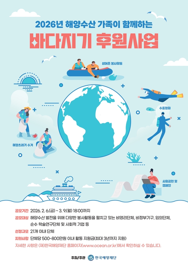 한국해양재단(이사장: 문해남)은 해양수산 분야에서 봉사활동을 펼치는 비영리 민간단체와 NGO 등을 지원하기 위한 ‘2026년 해양수산 가족이 함께하는 바다지기 후원사업’을 추진한다고 6일 밝혔다.