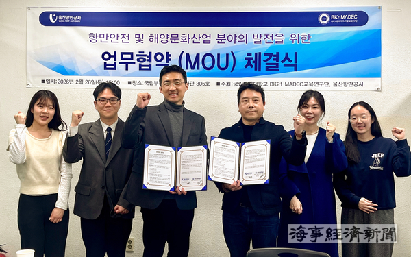 울산항만공사(UPA, 사장 변재영)는 2월 27일 국립부경대학교 BK21 MADEC 마린디자이니어링 교육연구단(단장 김면)과 해양·수산·항만 분야 전문인력 양성과 항만 안전·해양문화 발전을 위한 업무협약을 체결했다고 밝혔다.