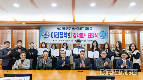 국립한국해양대학교가 가야고등학교 출신 동문들이 뜻을 모아 설립한 아라장학회로부터 장학금을 전달받으며 후배 지원을 위한 나눔을 이어갔다.
