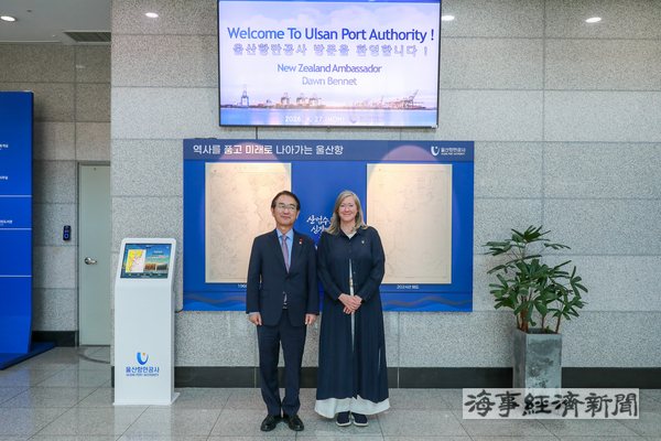 울산항만공사(UPA, 사장 변재영)는 던 베넷 주한 뉴질랜드 대사 일행이 27일 울산항을 방문해 항만 운영 현황을 확인하고, 글로벌 공급망 위기 대응을 위한 정보 교류와 협력 방안을 논의했다고 밝혔다.
